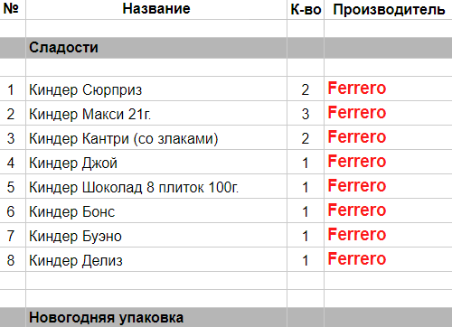 Киндер Сюрприз (2 шт),  Киндер Макси 21 г. (3 шт),  Киндер Кантри (со злаками) (2 шт),  Киндер Джой (1 шт),  Киндер Шоколад 8 плиток 100г. (1 шт),  Киндер Бонс (1 шт),  Киндер Буэно (1 шт),  Киндер Делис (1 шт)